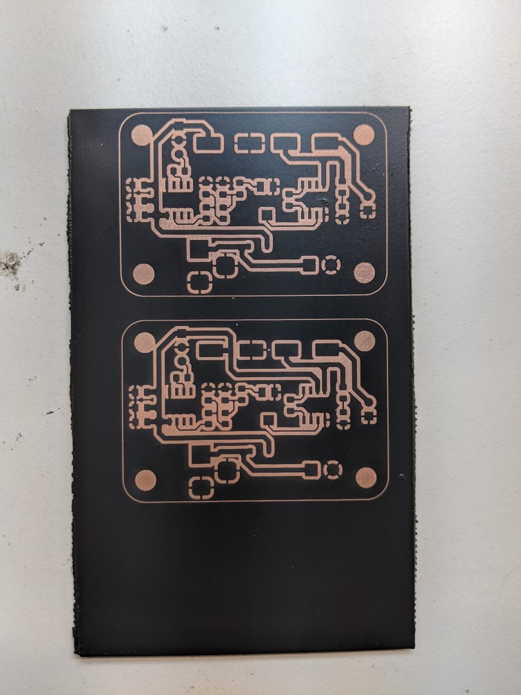 The method I described should work, in theory, even for double-sided PCBs, but we currently lack templates for the laser engravers to correctly align the two layers. We are working on them, as well as templates for our CNC mill to drill holes for PTH components and to cut the boards to shape.